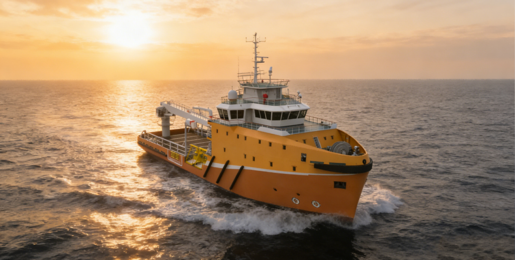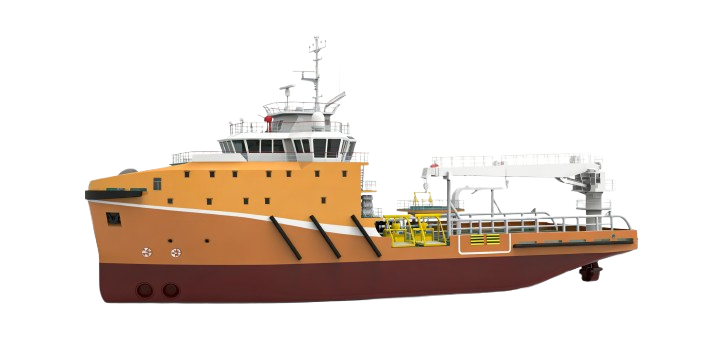 57.10 m long and 16.00 m wide. With a 3.00–3.70 m draft, it offers a 345 m² deck with 5.0 ton/m² load capacity and 300-ton deck cargo capacity. Powered by dual gensets and thrusters, it reaches 12.0 kn, supporting offshore diving and logistics tasks.
