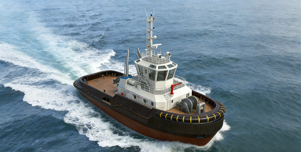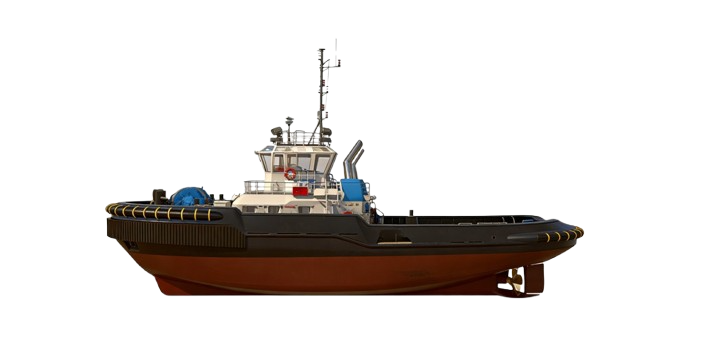 The TUG is an ASD harbour tug measuring 36.00 m long and 13.20 m wide. Powered by two 3700 kW main engines with FPP azimuth thrusters, it delivers 75-tonne ahead bollard pull and a 14.0 kn max speed. Its 100 m² deck and 5.0 ton/m² load capacity support versatile port operations.